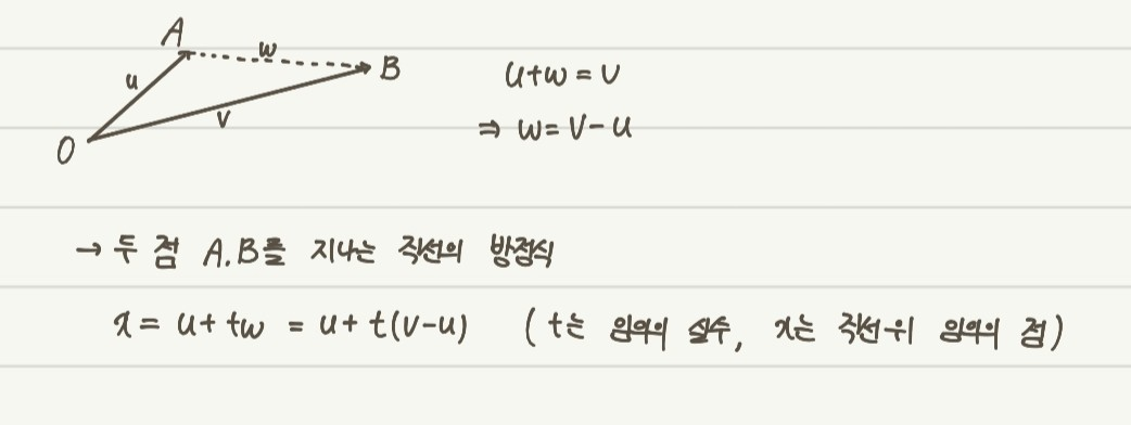 따라서 두 점 A, B를 지나는 직선의 방정식은 x = u + tw = u + t(v-u) 가 된다.