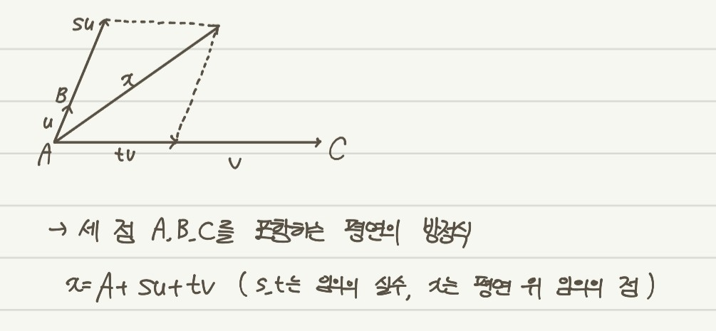 세 점 A,B,C를 포함하는 평면의 방정식은 x = A + su + tv로 나타낼 수 있습니다.