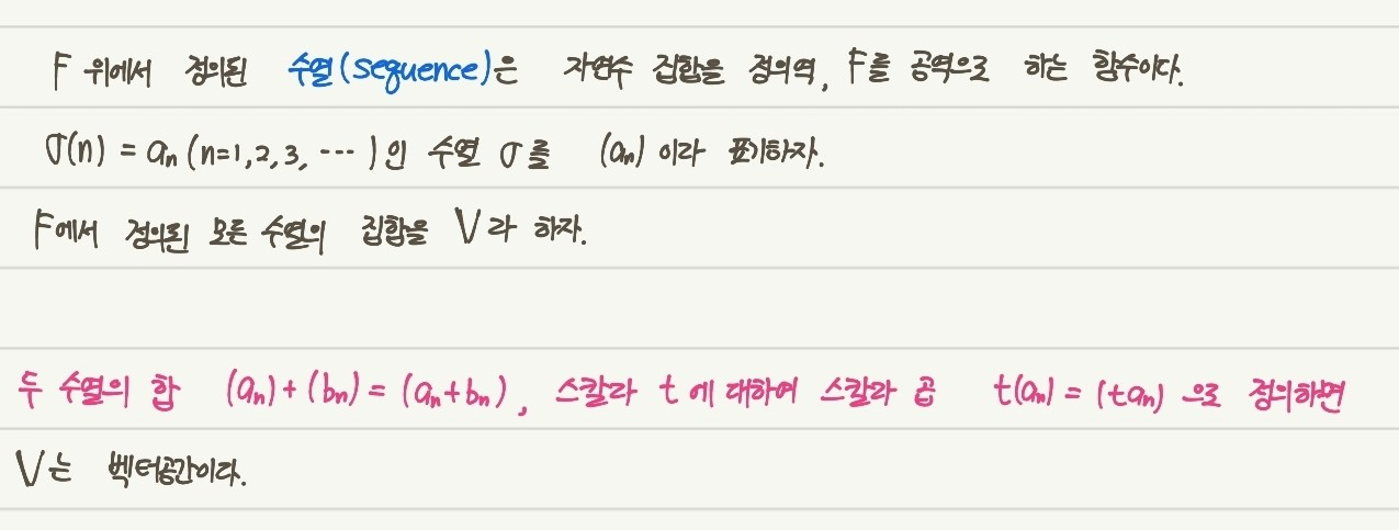 체 F에서 수열을 위와 같이 정의하고, 두 수열의 합과 스칼라 곱을 빨간색 글씨처럼 정의한다면,
